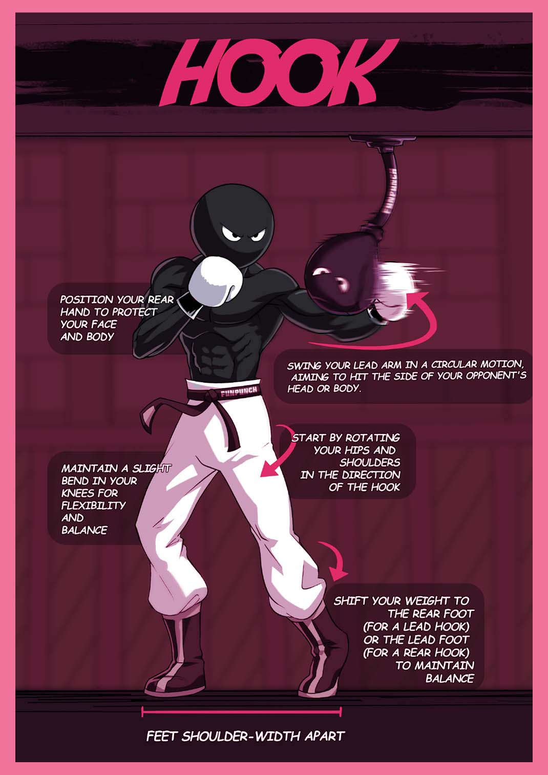 The hook is your ambush — coiled tight, coming from the side where they forgot to look. Rotate your hips, keep the elbow level, and fire like you’re swinging an axe.