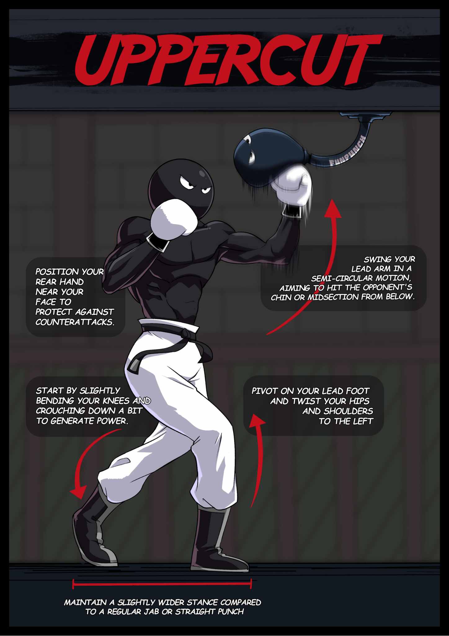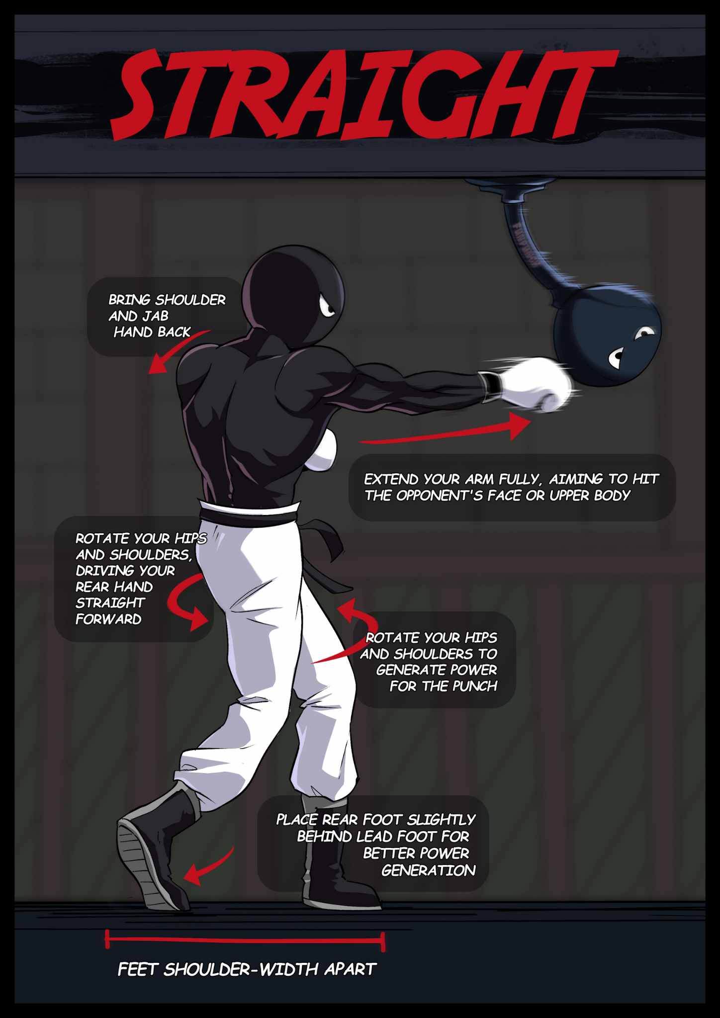 Your rear hand is your cannon. Launch it with your whole body. Twist from the hips, drive from the toes, and make sure your punch isn’t just felt — it’s remembered.