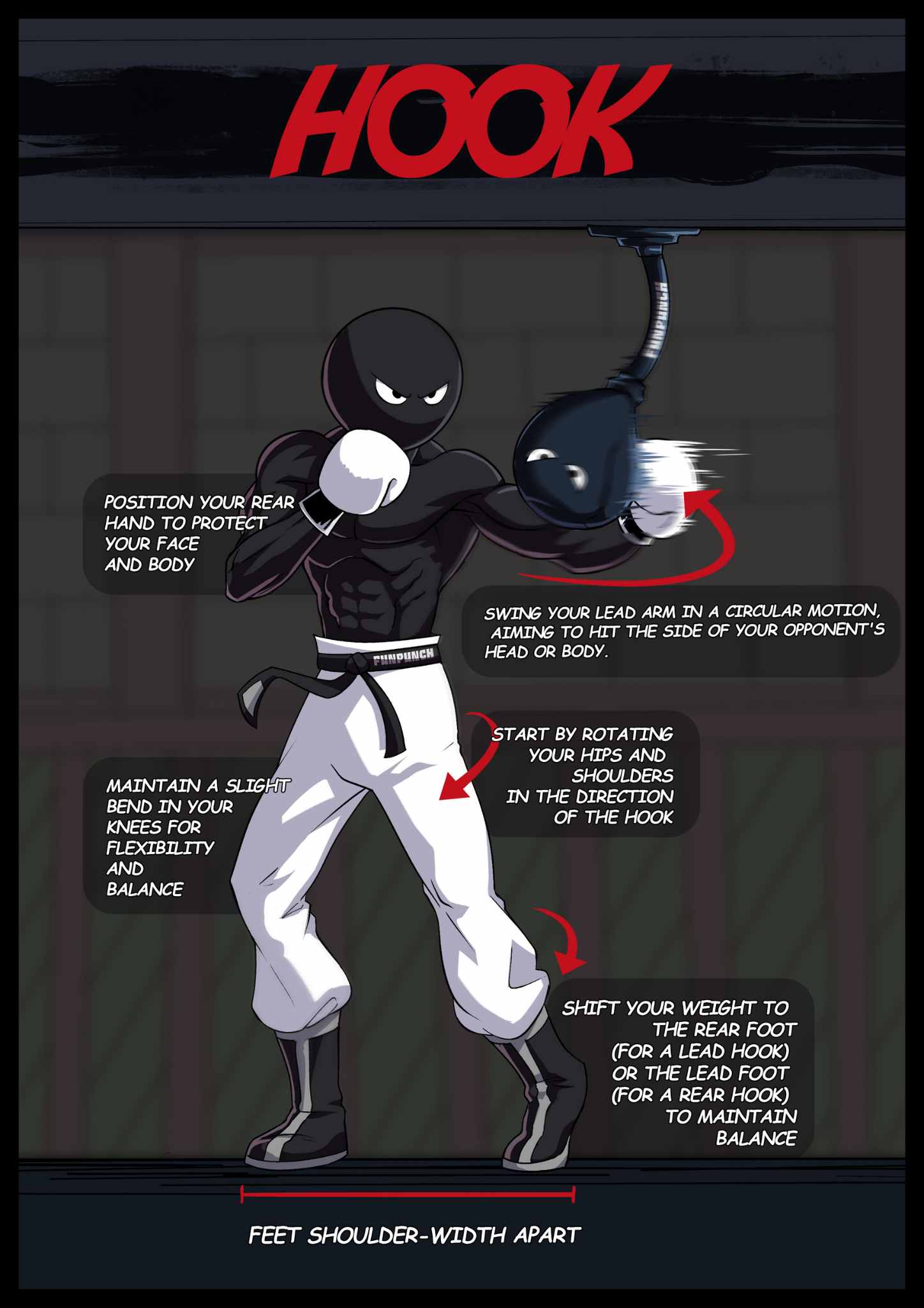 The hook is your ambush — coiled tight, coming from the side where they forgot to look. Rotate your hips, keep the elbow level, and fire like you’re swinging an axe.